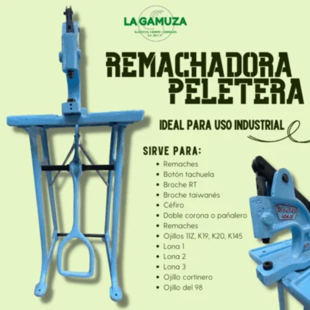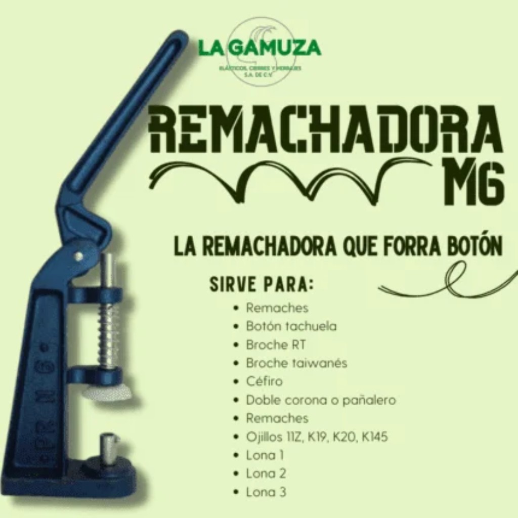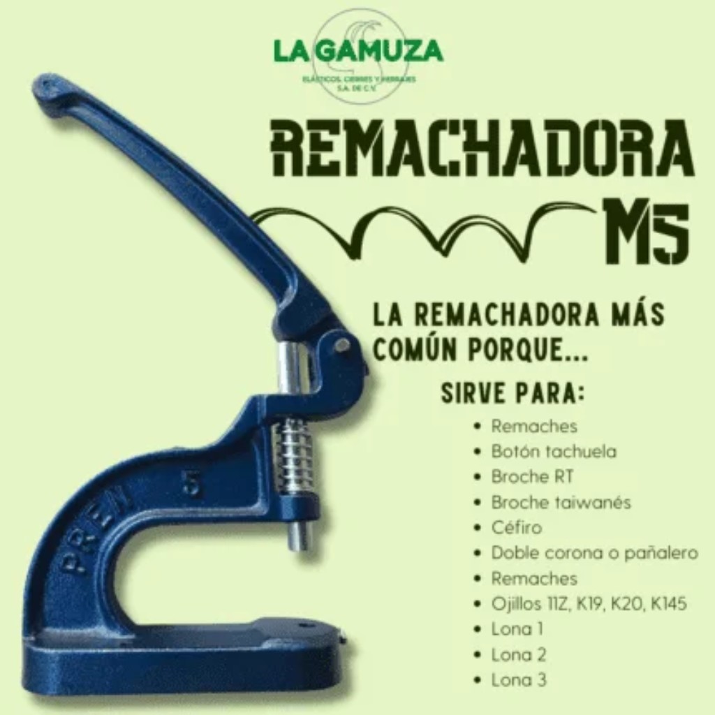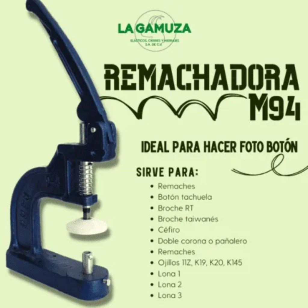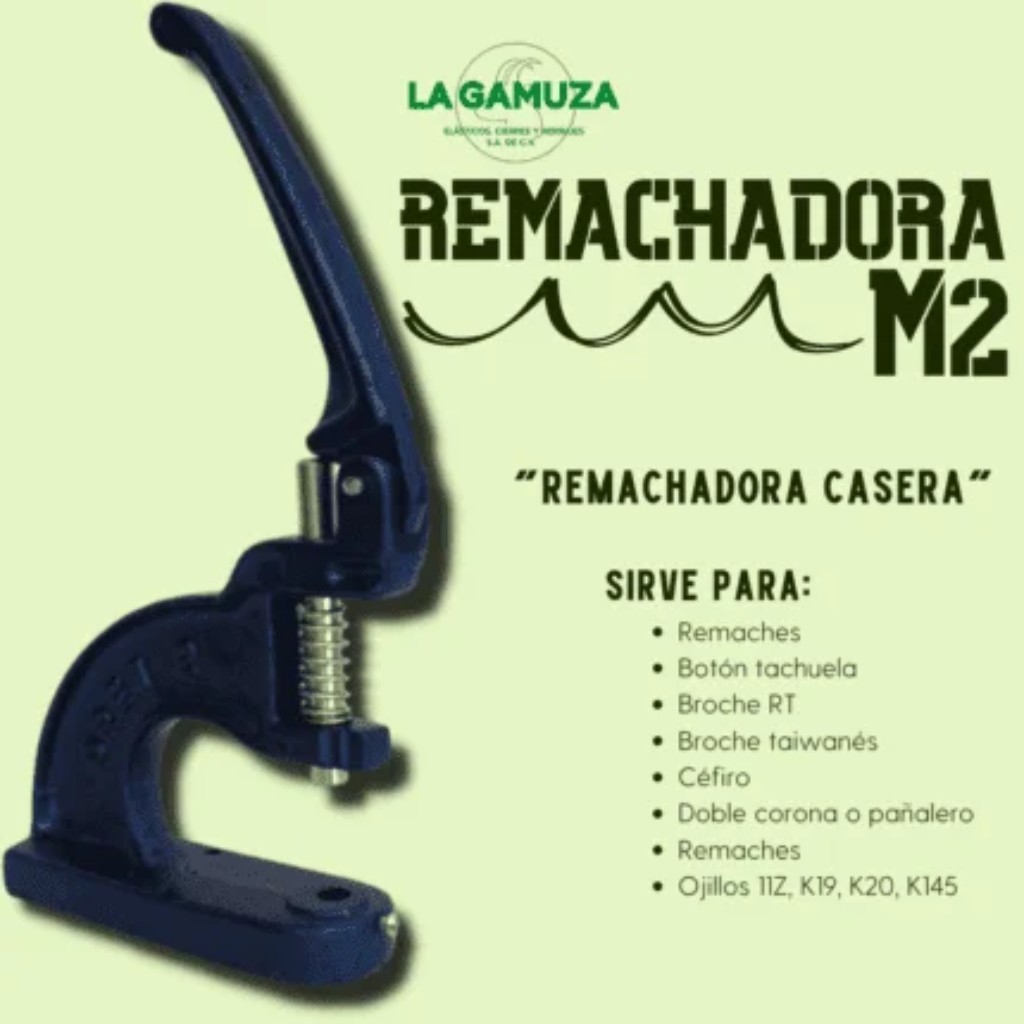- Funciona bien para colocar remaches, botón tachuela, broche RT, broche taiwanés, céfiro, doble corona o pañalero y ojillos de tamaños 11Z, K19, K20, y K145.