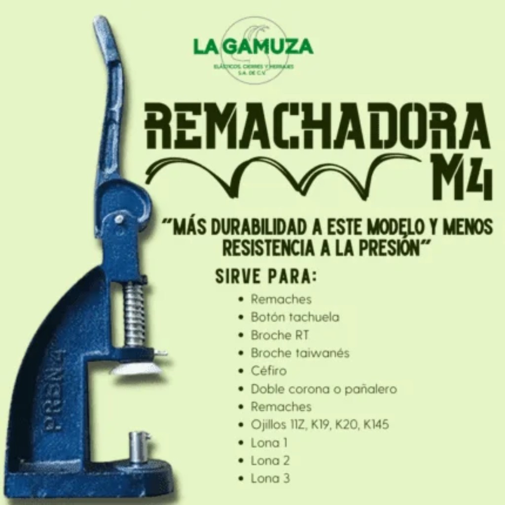 - Es adecuada para todos los trabajos que realiza la M2, pero además puede manejar ojillos de lona de tamaños 1, 2 y 3.